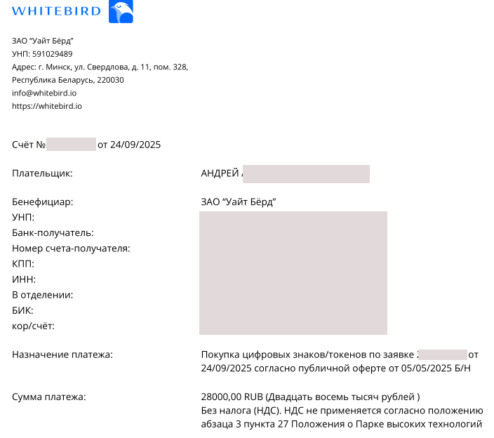4. После исполнения поручения банком (платёжка с отметкой банка "ИСПОЛНЕНО") + инвойс самого Whitebird (не спрашивайте почему у них самих его нет) выслать в Whitebird через форму "Поддержка". Whitebird после проверки отправляет Вам на кошелёк выбранную криптовалюту.