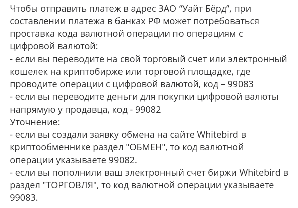 На запрос отвечаем: “Здравствуйте, 9908_, Спасибо, хорошего дня!” и обязательно прикладываем трёхстраничный документ, который нам выдала биржа. Через какое-то разумное время (~1 час) поддержка отвечает, что у валютного контроля больше нет вопросов, а перевод меняет статус на окончательно ушедший из банка. Как выбрать правильный код операции? Вот инструкция от Whitebird: