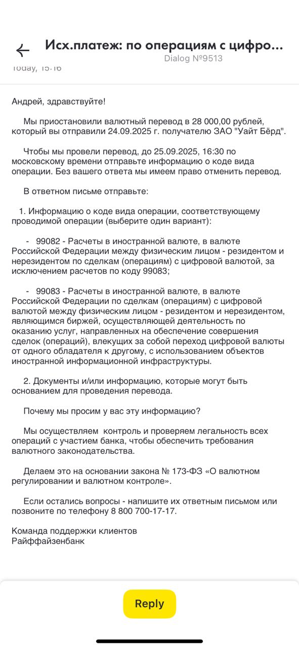 А после в раздел обмена документами придёт запрос со стороны банка (также как со SWIFT-переводами, если Вы их застали). Когда это произойдёт, не бойтесь - Вы всё делаете законно, при одном условии - у Вас есть законное происхождение денежных средств (зарплата или Вы продали что-то дорогое, со всего этого уплачены налоги и т.д.). Просто если этого нет, то международный перевод может быть триггером для проверки счёта по 115-ФЗ и в самой проверке нет ничего страшного, но если Вы не сможете дать ответы на простые вопросы, счёт закроют, а деньги Вы будете забирать лично в кассе.
